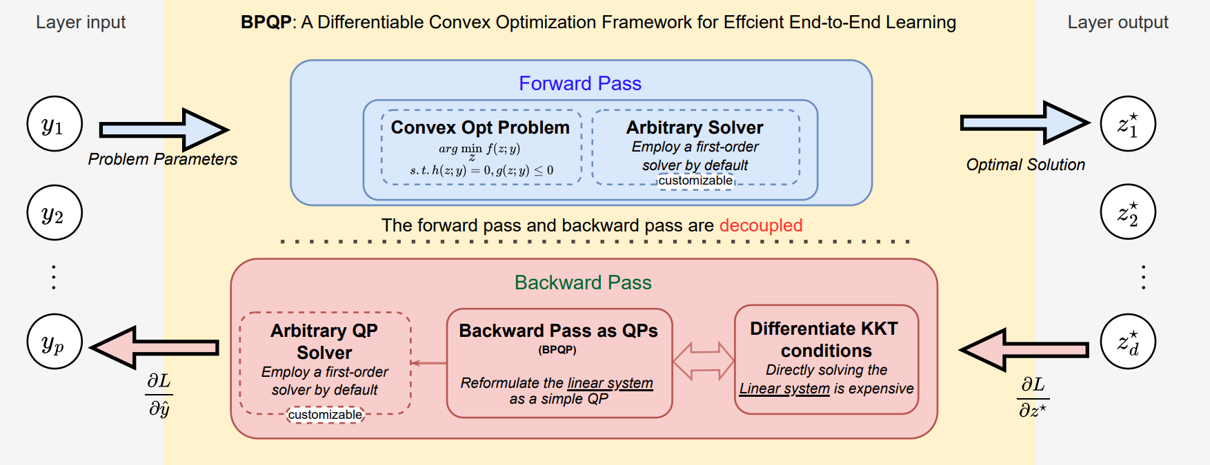 The forward pass computes the optimal solution, the backward pass computes the gradient of the optimal solution with respect to the parameters \(\theta\).